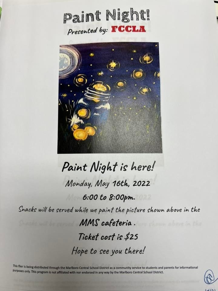 FCCLA is hosting a SNACK and PAINT night in the Marlboro Middle School Cafeteria. We will be painting a firefly night scene. It is $25 per person and space is limited. Please contact Mrs. Giacoia or Mrs. Zehnacker to reserve your spot!