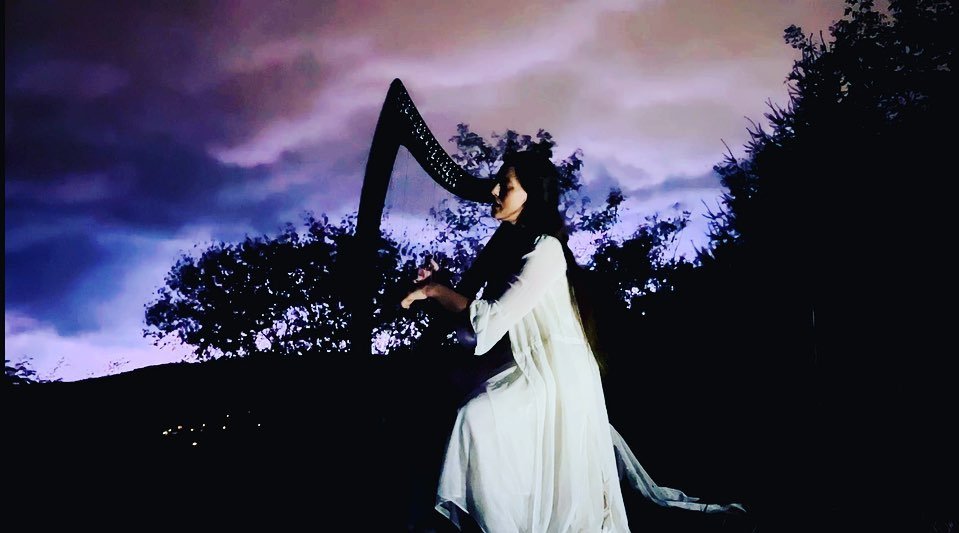 Emily Quant’s deep singing voice and skilled harp playing are enchanting