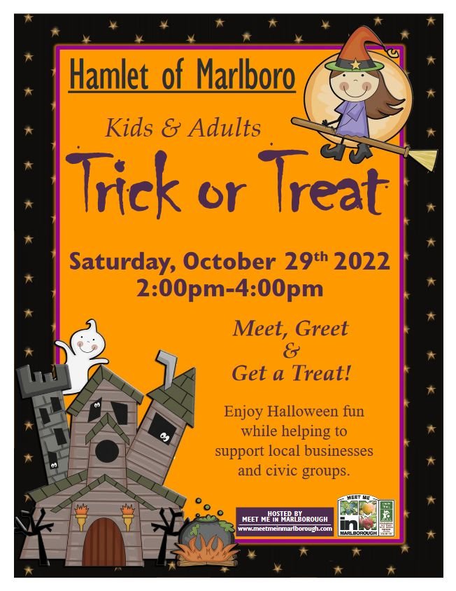 Come stroll through the quaint hamlet of Marlboro, meet & greet many local business owners, civic/school groups and community organization representatives. Adults receive local savings and information and kids get a treat! Join in many Halloween festivities (Dance, Costume Contest, Music, Ice Cream Sundaes, Samples, Food, Crafts and Much More!