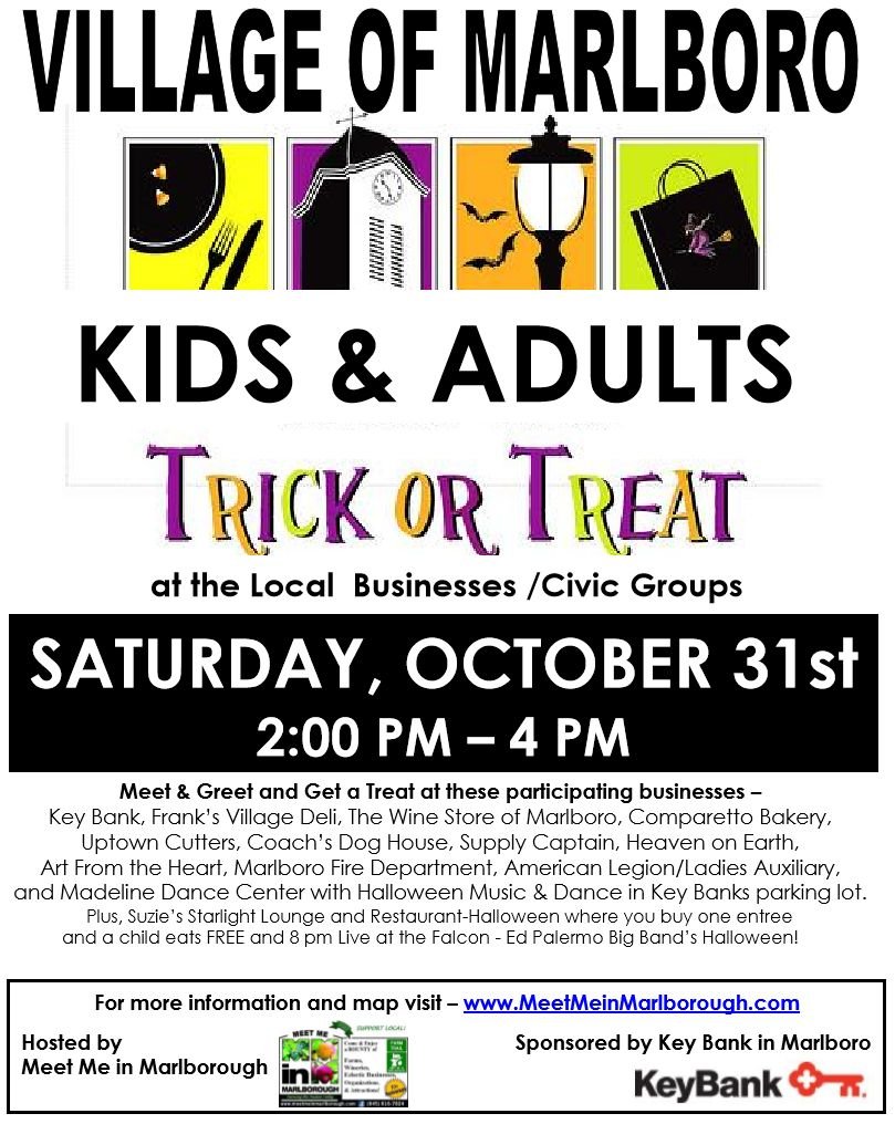 Visit the Village of Marlboro on Sat.10/31 2 pm – 4 pm and receive a Halloween Treat for both kids and adults from local the businesses owners. Currently participating in this years event- Key Bank, Frank’s Village Deli, The Wine Store, Captain Supply, Uptown Cutters, Coach’s Dog House, Heaven on Earth, Art From the Heart and Marlboro Fire House.