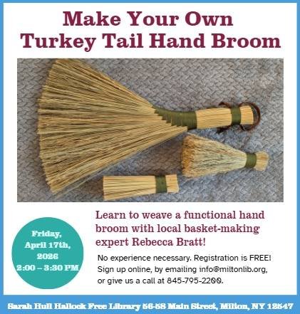 Join Rebecca Bratt, basket weaving artist, as she guides you through the process of weaving your own turkey tail hand broom. Learn about materials and techniques in a beginner-friendly space. Supplies are provided.