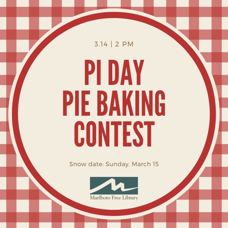 The Library will be celebrating “Pi Day, or “π Day” (March 14) with our third annual pie making contest! Sign up to enter the contest in person at the Library, then drop off your pie by 1:00 p.m. on Saturday, March 14. The winner receives bragging rights for having baked the best pie in Marlborough, and a gift certificate to a local business! The runner up and third place will also receive prizes. All contestants must turn in a completed entry form, available at the circulation desk or by clicking here.