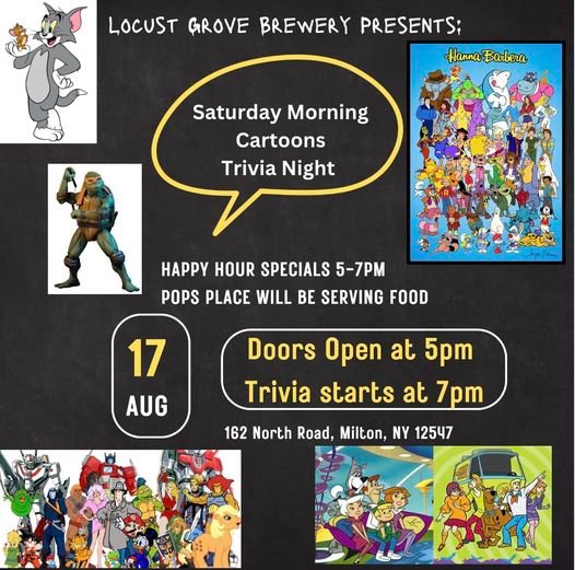 Come on friends…remember waking up early on a Saturday morning, your parents telling to get a bowl of cereal and watch some cartoons! Do you have what it takes…Bring it this Thursday to Locust Grove Brewing Company. Good eats by Pop’s Place, cold drinks and Julie Ann Cestaro and myself behind the bar!