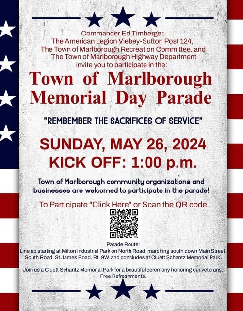 For those of you asking for Town of Marlborough Memorial Day Parade Details. An email was sent to those who registered a group. Below are the details for the parade. THIS YEARS PARADE IS IN MILTON.