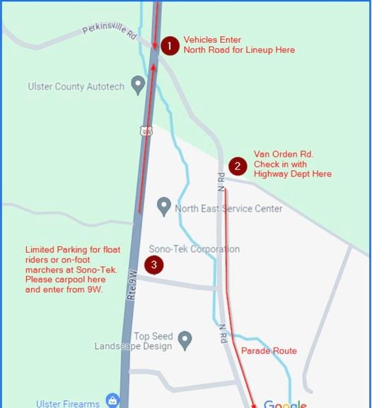 Participants are asked to arrive from North Road off of 9W across from Perkinsville Road. Please see the map for clarification. You will be greeted by a Town of Marlborough Highway Department Employee who will give you your assigned number in the parade. You will find that number printed along the south side of North Road. Please position your float or marchers in your assigned spot. Limited parking is available in the parking lot of Sono-Tek Corporation (2012 Rte 9W). However, we ask the majority of parade participants to be dropped off at the lineup. You may also park in the Cluett Schantz Memorial Park and carpool to the start of the parade. If you have any additional questions, please feel free to reach out to Arlette Porpiglia or Jenna Lazaroff.