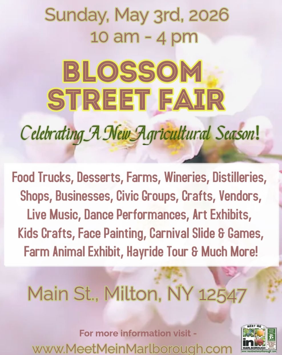 Come join us to celebrate the start of the agricultural season at the Blossom Street Fair in the hamlet of Milton! Crafts, Vendors, Farms, Wineries, Breweries, Food, Music, Dance, Entertainment, Kids Activities, Vendors, Shops/Businesses/Store Front Sales & Touch A Truck & Farm Tractor Displays, Farm Animal Petting Area, Informational Tables, Fruit Blossom Hayride Tour and much more! A great way to enjoy the day and support local! This event currently has a honey, permanent jewelry, tastefully simple, color street nails and soy candle vendor.